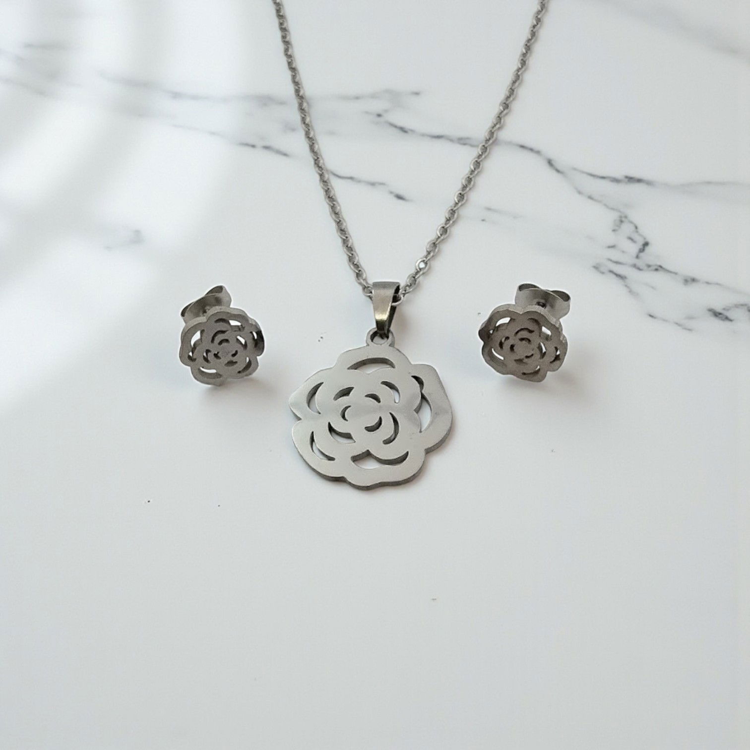 Conjunto Aros Collar 45 cm Flor Acero Quirúrgico - 800027